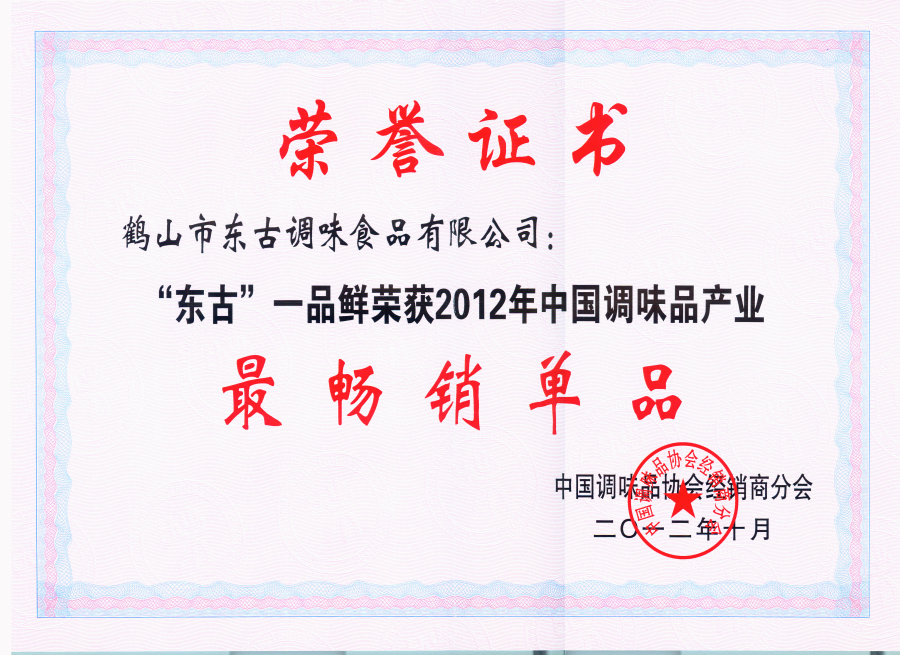 2012東古一品鮮獲2012最暢銷單品獎項證書